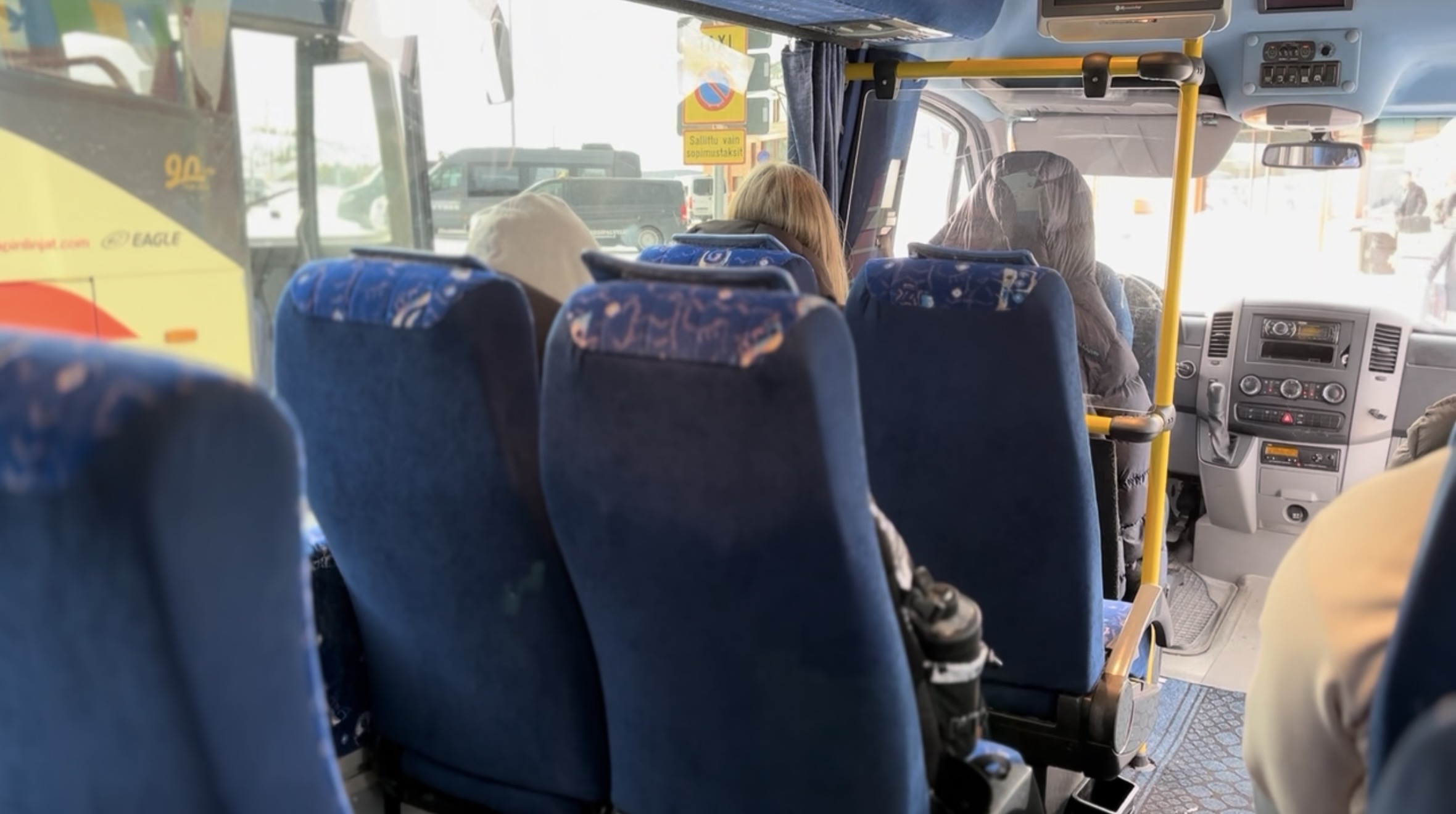 正直、当日までは「空港出たあと、ちゃんと見つけられるかな……」と少し不安でした。でも、これは完全に杞憂。イヴァロ空港の建物を出たら、目の前がすぐ駐車場で、送迎バスやタクシーがずらっと並んでいます。Ilmari Slant Ky の車には社名が書いてあるので、すぐ分かりました。